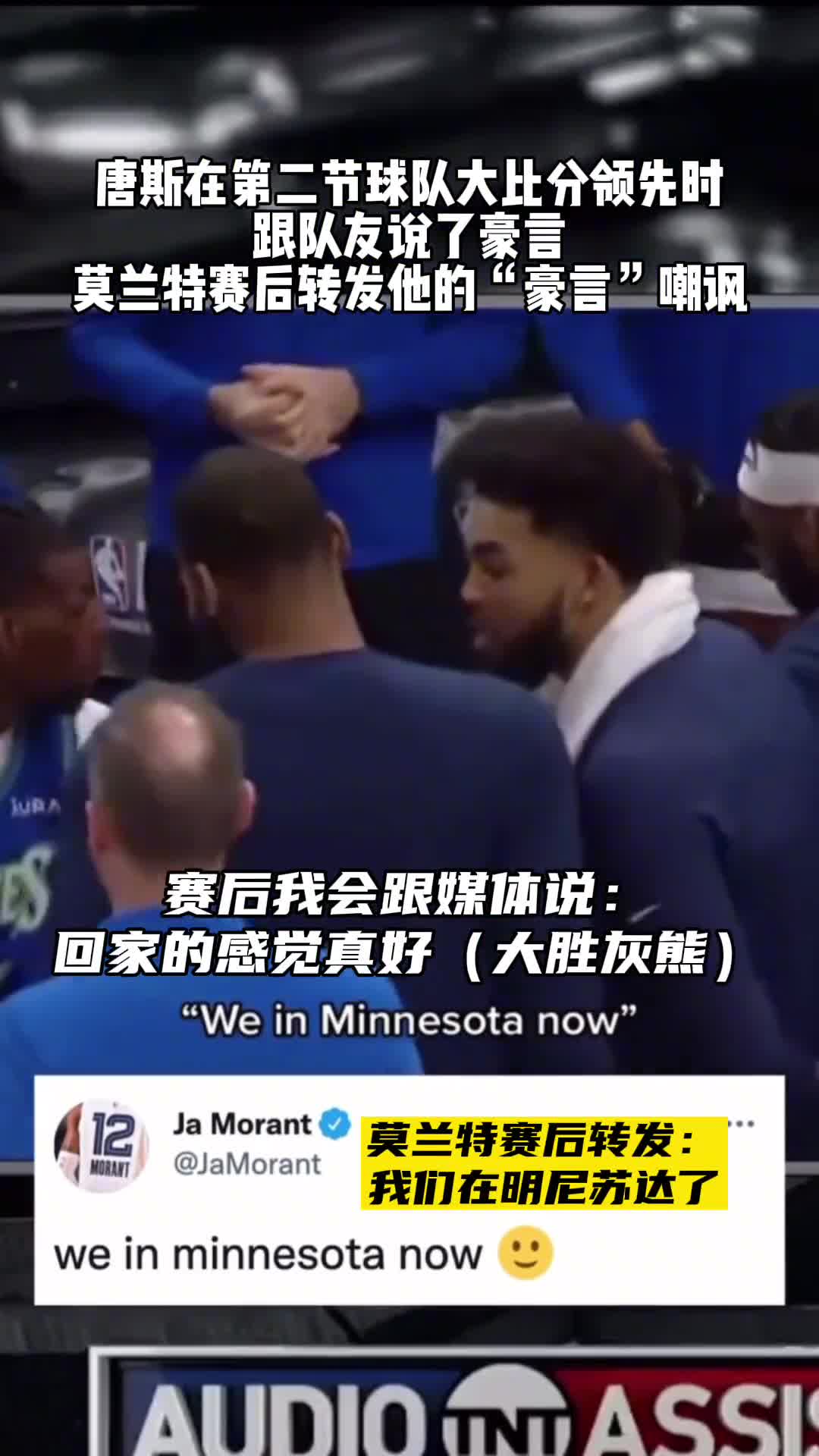 昨日上半场大比分领先 唐斯场边得意忘形 说完被追上20+分差